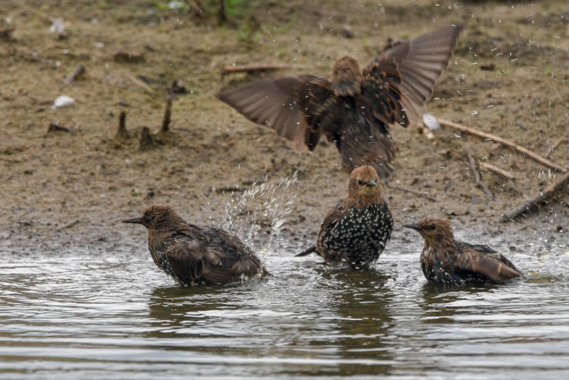 Medio augustus ben ik twee dagen in België geweest om vanuit verschillende schuilhutten te fotograferen. De eerste schuilhut is gericht op trekvogels, maar de trek was nog niet echt begonnen. Voor de hut lag een grote waterplas waar gewoonlijk veel vogels komen drinken en foerageren. Het water was door de langdurige droogte echter zo laag dat ik voornamelijk op een droge grijze modderpoel uitkeek. Het was stil. Alleen een familie waterhoenen was dominant aanwezig. Zo dominant dat ze iedere vogel die zich in de buurt vertoonde, agressief wegjoegen. Ik moest het dus doen met de waterhoenen en een paar ontsnapte konijnen die steeds heen en weer renden. Soms kwamen er wat scholeksters en kieviten langs of landde er een groep spreeuwen. Dan maar proberen om van deze "gewone vogels" proberen mooie foto's te maken. Dat levert soms verrassende resultaten op. Thuisgekomen zag ik deze foto van een groepje badende spreeuwen. Op de achtergrond een opvliegende spreeuw met toch onmiskenbaar het hoofd van een man met baard.