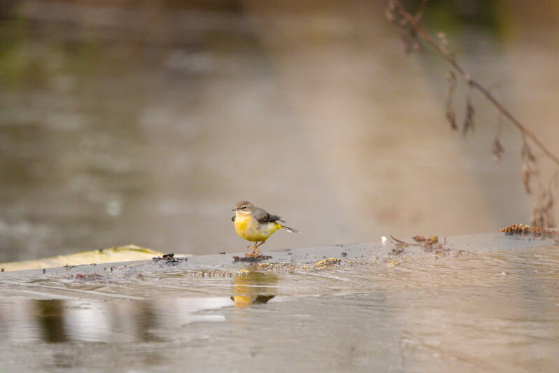 Op de website van de hut www.fotohut-alblasserwaard.nl had ik al gezien dat een grote gele kwikstaart een paar keer was gesignaleerd voor de hut. Op het ijs in de vijver hipte hij/zij even langs.
