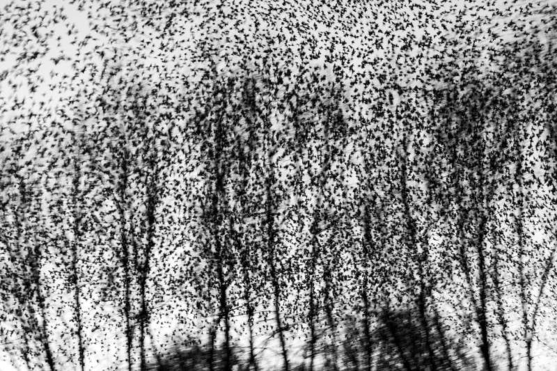 Na een tijdje allerlei prachtige vormen te hebben vastgelegd, verlaag ik de sluitertijd om meer beweging in het beeld te krijgen. Dat is goed te zien op de foto hiernaast waar een roofvogel in beeld verschijnt, die veel trager vliegt dan de zwerm beweegt. ( 1/160 sec) De roofvogel is scherp tegen een achtergrond van onscherpe spreeuwen. Later ga ik over tot nog lagere sluitertijden (1/30 sec) . Dat geeft weer een heel ander effect, zeker bij deze zwart-wit opname met een groepje bomen in beeld.