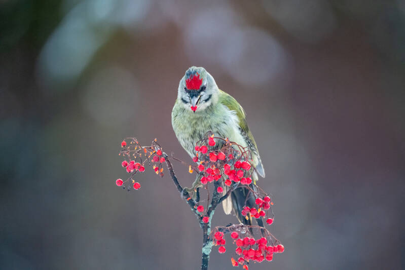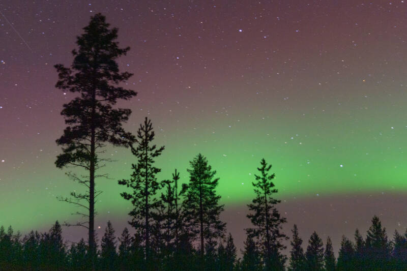 Veel kleine meesjes en gaaien en iedere dag kwam even de grijskopspecht een besje eten. Pas de derde dag kwam de steenarend voor de hut. Mooi dichtbij, zodat ik zelfs portretfoto's kon maken. Het werd de dagen erna steeds warmer en de sneeuw verdween bijna helemaal. Die dag werd een heftig noorderlicht voorspeld. Het zou, volgens de app, beginnen om 20.00 uur. In de plaats waar ik verbleef was het echter behoorlijk bewolkt. We zijn met nog een aantal mensen, richting de kust gaan rijden, omdat het daar beter zou zijn. Uiteindelijk vonden we een mooie open plek aan een bosrand. Toch viel het een beetje tegen, mooi, maar niet zo spectaculair als voorspeld. En koud.